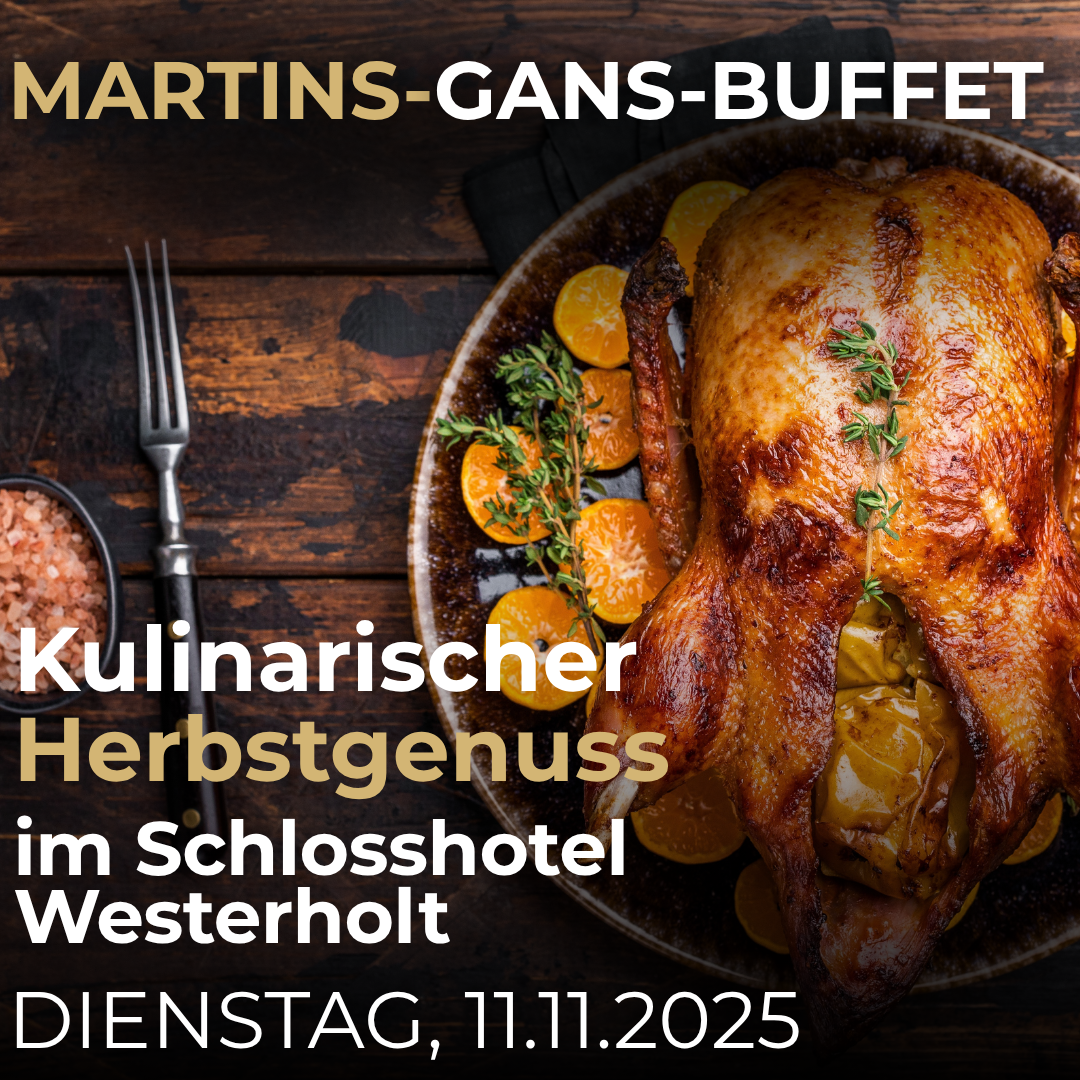 Am 11. November 2025 lädt das Schlosshotel Westerholt von 18:00 bis 21:00 Uhr zum traditionellen Martins-Gans-Buffet ein. In stilvollem Ambiente erwartet Sie ein festliches Drei-Gang-Menü, das kulinarische Klassiker der Herbstzeit elegant vereint. Genießen Sie einen genussvollen Abend mit saisonalen Spezialitäten, die mit viel Liebe und Sorgfalt zubereitet werden – perfekt für ein stimmungsvolles Novembererlebnis.