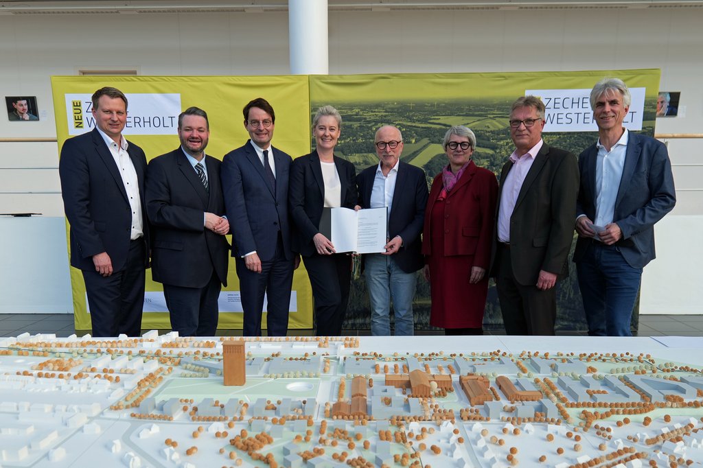 Gelsenkirchens Oberbürgermeisterin Andrea Henze (4.v.l.) und Hertens Bürgermeister Fred Toplak (4.v.r.) nahmen im Beisein vom Christoph Heidenreich, Stadtbaurat der Stadt Gelsenkirchen, Simon Nowack, Vorstand der Wirtschaftsförderung Gelsenkirchen, Regierungspräsident Andreas Bothe, Bernd Lohse, Geschäftsführer der Entwicklungsgesellschaft Neue Zeche Westerholt, und Wolfgang Jung, Geschäftsführer des Wissenschaftsparks Gelsenkirchen, den Förderbescheid von Staatssekretärin Silke Krebs (3.v.r.) entgegen.