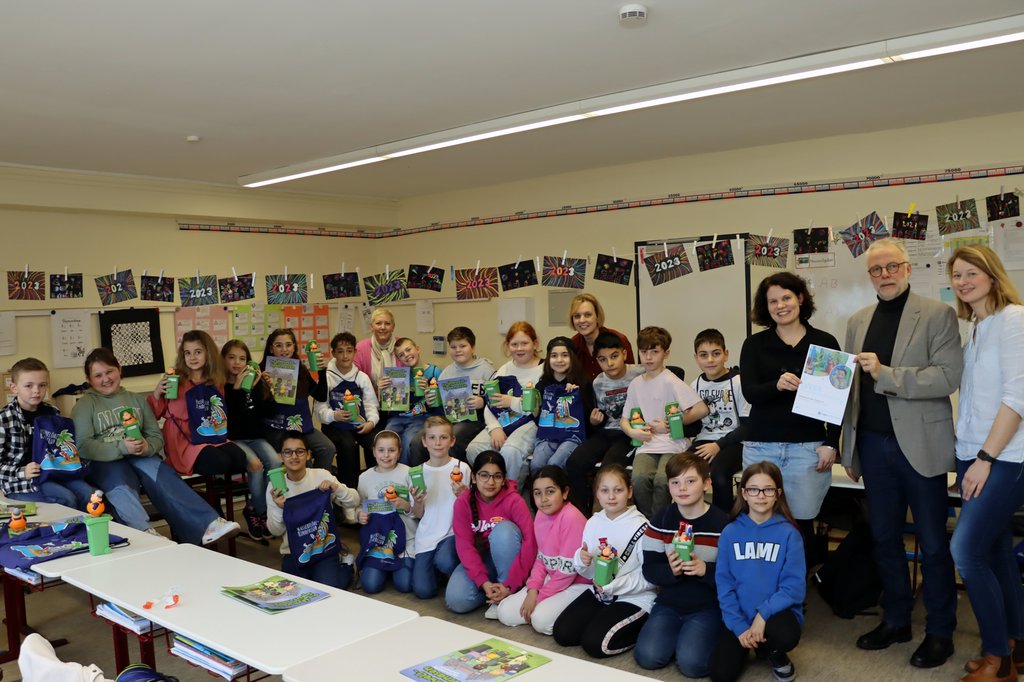 Als Dankeschön gab es unter anderem Süßigkeiten, die in einer Mini-Mülltonne versteckt waren, und das Heft der Umweltspürnasen, in dem das Fohlen Hedda gemeinsam mit seinen Freundinnen und Freunden Abfalltrennung kennenlernt. Auch die Hertener Stadtwerke beschenkten die Kinder: Es gab Copi-Turnbeutel und als absolutes Highlight einen Gutschein für einen Besuch der Copa Ca Backum-Wasserwelt.