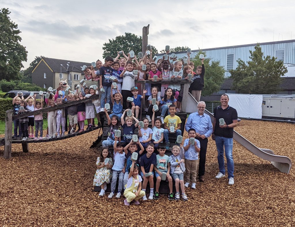 Gemeinsam mit dem Zentralen Betriebshof Herten (ZBH) und dessen Maskottchen Hedda verteilte Bürgermeister Matthias Müller Brotdosen an die Erstklässlerinnen und Erstklässler der Hertener Grundschulen.