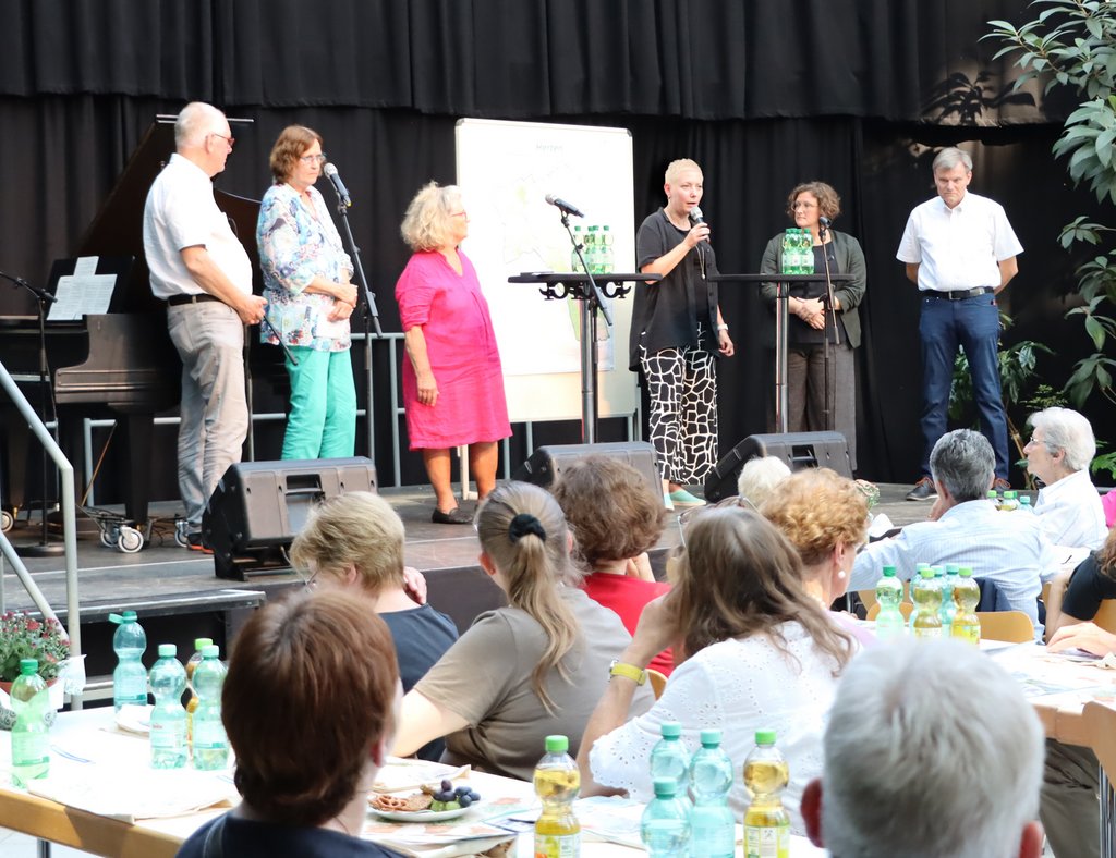 Um den Neubürgerinnen und Neubürgern Herten näher zu bringen, holte sie sich Unterstützung aus den Kreisen der engagierten Bürgerinnen und Bürger an die Seite: Auf der Bühne erzählten Jörg Kersten (Stadtsportverband), Angelika Wendt-Süberkrüb (Förderverein Musikschule), Ruth Heine (Förderverein Stadtbibliothek) und Cay Süberkrüb (Freiwilligenagentur) von ihrem Engagement und den dahinterstehenden Institutionen. Kerstin Walberg, Presssprecherin der Hertener Stadtwerke, stellte das Copa Ca Backum vor und gab einen Einblick in das vielfältige soziale Engagement des städtischen Tochterunternehmens.