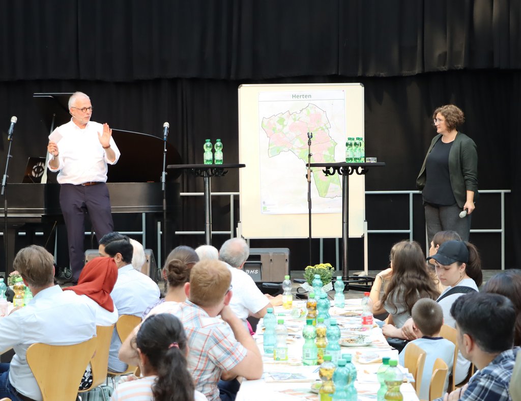Bürgermeister Matthias Müller zeigt beim Neubürgerempfang den rund 150 Teilnehmenden auf einer Karte sehenswerte Orte in Herten. Rechts im Bild: Moderatorin Stefanie Hasler.