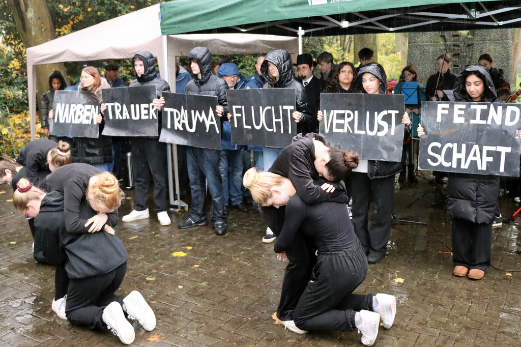 Schülerinnen und Schüler der Martin-Luther-Schule tragen mit einer tänzerischen Darbietung und einer Plakataktion zum Volkstrauertag 2024 bei. (Foto: Stadt Herten_Marco Baron)