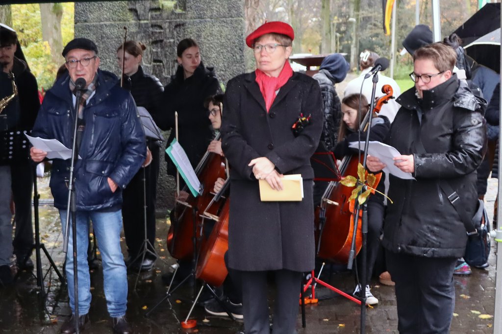 An das Leid, das durch Kriege entsteht und Menschen zugefügt wird, sollten alle Beiträge mahnend erinnern. So trugen für die Arras-Freunde, den Freundeskreis Doncaster und den Freundeskreis Szczytno-Herten die drei Mitglieder Dr. Babette Nieder, Christa Vanselow und Jürgen Hoffmann gemeinsam das Gedicht „Krieg dem Kriege“ von Kurt Tucholsky vor. Gerd Lange, Vertreter der Vereinigung der Verfolgten des Naziregimes-Bund der Antifaschisten, las aus dem Brief eines französischen Soldaten aus dem Ersten Weltkrieg vor und Selman Duran vom Zentrum für Bildung und Integration e. V. sprach ein Friedensgebet.