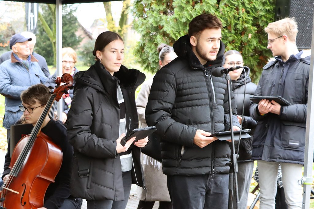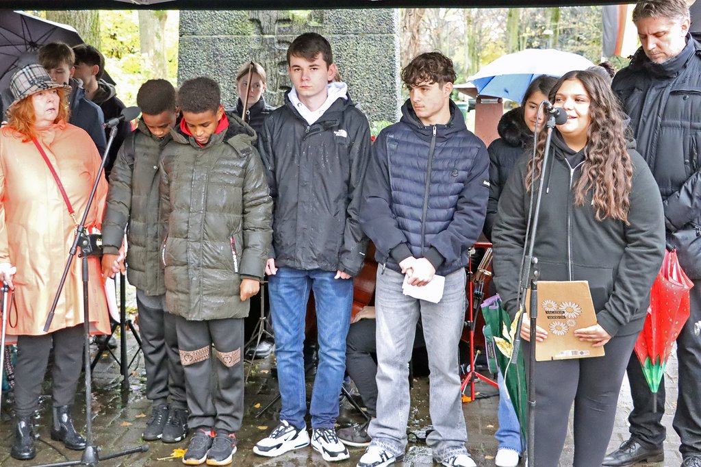 Schülerinnen und Schüler der Willy-Brandt-Schule sorgen mit Redebeiträgen und einem selbst komponierten Lied für Gänsehautmomente am Volkstrauertag 2024 in Herten. (Foto: Stadt Herten_Marco Baron)