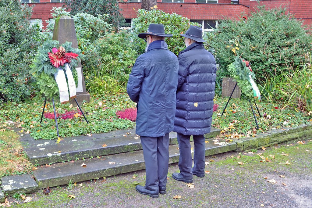 Bürgermeister Matthias Müller (r.) und Peter Ziegel, Vorsitzender des VdK in Herten, legen am Volkstrauertag 2024 Kränze nieder. (Foto: Stadt Herten_Marco Baron)