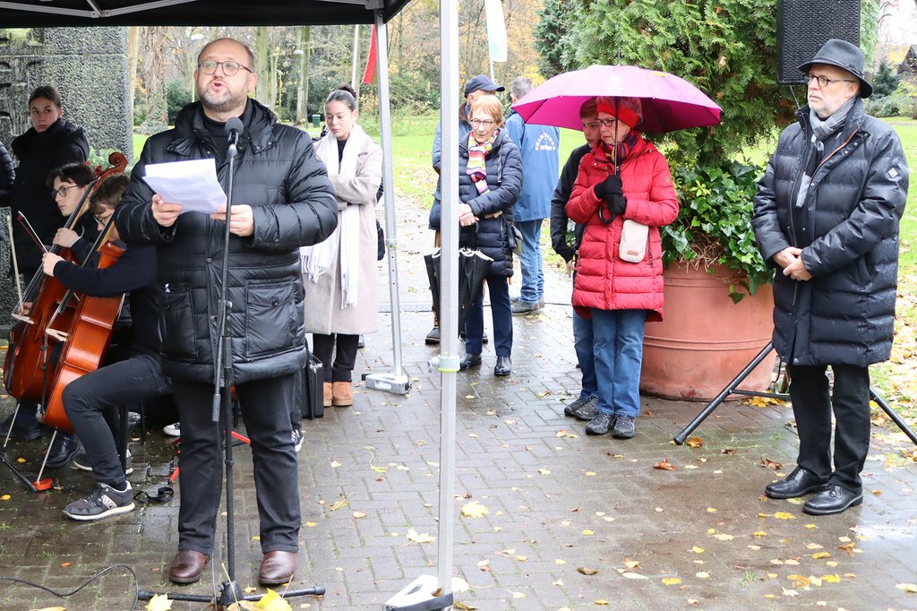 Als um 10 Uhr die Trompete von Ingo Jülicher erklang, schien es, als würde auch der Himmel wegen der vielen Toten und Opfer vergangener und aktueller Kriege weinen. „Jedes Jahr halten wir inne, um des großen Leids der Menschen in der Vergangenheit, Gegenwart und leider auch in der Zukunft zu gedenken. Wir erinnern uns an die Millionen Opfer vergangener Kriege und an die Hunderttausenden, die durch aktuelle Konflikte ihr Leben verlieren. Dabei kennen wir doch die Bedingungen, die zu Kriegen führen. Wir kennen die geschichtlichen Fakten. Wir wissen, welche Voraussetzungen Konflikte begünstigen. Gerade weil es manchmal so scheint, als sei unser heutiges Innehalten und Gedenken sinnlos, wird doch umso deutlicher, wie wichtig es ist, dass wir standhalten. Dass wir in die Welt hinausrufen: Wir wollen Frieden,“ so Bürgermeister Matthias Müller in seiner Eröffnungsrede am Volkstrauertag am Margarete-Stein-Platz in Herten. „Unsere Botschaft, den Frieden zu erhalten, muss unter die Haut gehen. Es muss uns berühren, wenn Menschen leiden. Es muss uns unter die Haut gehen und da muss es auch bleiben. Heute gedenken wir, aber wir machen uns auch gegenseitig Mut: Mut, uns zu engagieren – für Empathie, für Toleranz und für den Frieden auf der ganzen Welt.“