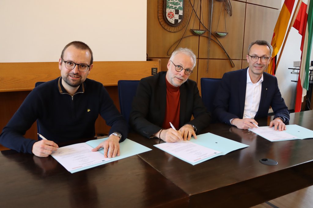 Zur Kooperationsvereinbarung-Unterzeichnung für die Jugendberufsagentur mit Bürgermeister Matthias Müller (M.) kamen Dominik Schad, Leiter des Jobcenters Kreis Recklinghausen (l.), und Frank Benölken (r.), Vorsitzender der Geschäftsführung der Agentur für Arbeit Recklinghausen, ins Rathaus (Foto: Stadt Herten).