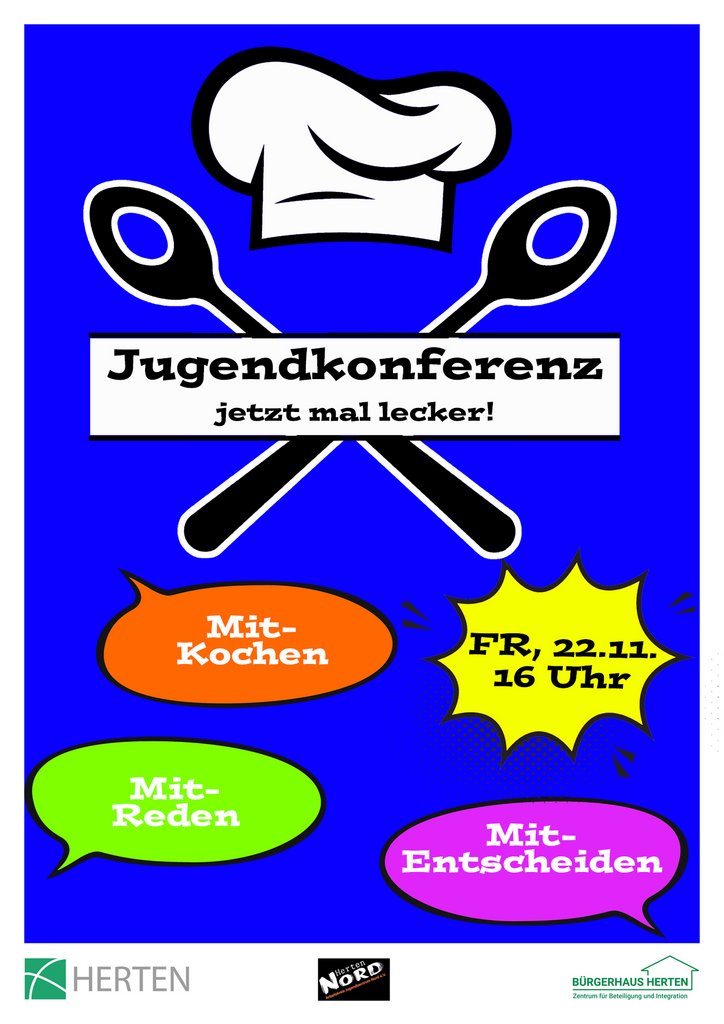 Am Freitag, 22. November, sind Hertener Jugendliche im Rahmen einer besonderen Jugendkonferenz gefragt. Ab 16 Uhr laden die Stadtverwaltung und das Team des Jugendzentrums Nord junge Menschen zum gemeinsamen Kochen, Essen und Austausch über aktuelle Hertener Themen ein. |