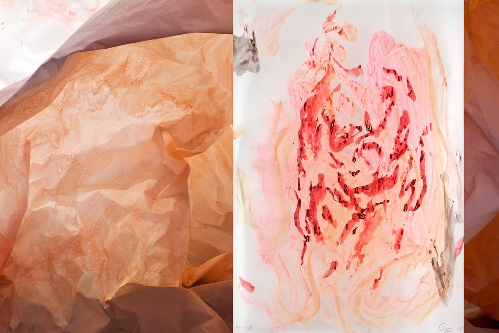 „Innere Körperempfindungen, Gefühle und Wahrnehmungen zum Umraum fließen mit ein“, sagt Christiane Schlieker-Erdmann. Die Papierobjekte aus transparentem Architektenpapier, mit Tusche bemalt und durch leichtes Wässern verformt, sind in ihrer Gestalt und Größe variabel.