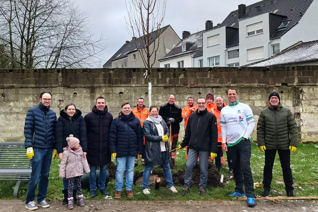 Mit einer besonderen Pflanzaktion wurde der neue Grünverbindungsweg im Neubaugebiet Schneeberger Straße am Freitag, 22. November, um eine Baumallee ergänzt. Anwohnerinnen und Anwohner brachten dabei gemeinsam mit dem Zentralen Betriebshof Herten (ZBH) ihre gespendeten Bäume in die Erde und gaben dem Weg eine persönliche Note. Die Bäume erhielten kleine Namensschilder mit den Namen der spendenden Personen, die das Engagement der Nachbarschaft sichtbar machen.