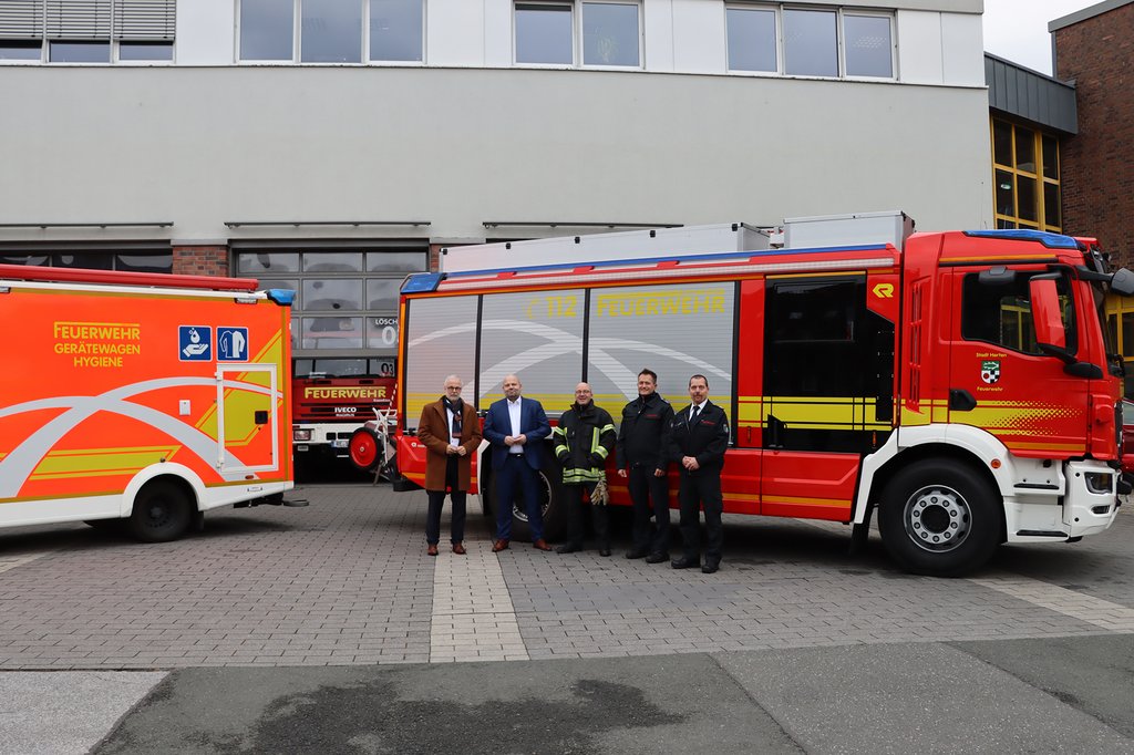 (v.l.n.r.) Bürgermeister Matthias Müller, Stadtkämmerer Dr. Oliver Lind, Jörg Stier (kommissarischer Leiter der Feuerwehr), Thorsten Geldermann (Leiter der Abteilung Technik) und Marc Pleßmann (Leiter der Kfz-Abteilung) bei der Vorstellung der neuen Fahrzeuge der Feuerwehr Herten.