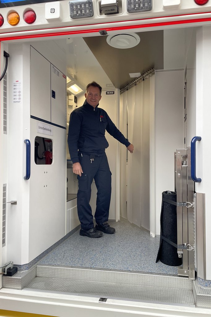Nach dem Umbau eines Rettungswagens steht der Berufsfeuerwehr Herten ein Gerätewagen Hygiene zur Verfügung, damit die Einsatzkräfte noch vor Ort die kontaminierte Kleidung austauschen können. Thorsten Geldermann (Leiter Abteilung Technik) stellt das Innenleben und die Vorteile des neuen Einsatzfahrzeugs vor.