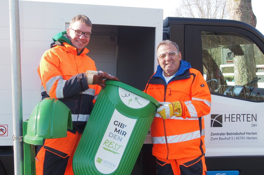 Geleert werden die einfach abzunehmenden Körbe an einer der Seitenluken des neuen Fahrzeugs, das den Abfall einer ganzen Tagestour aufnehmen kann. Mit der Anbringung weiterer Abfallbehälter, sollte den Bürgerinnen und Bürgern ermöglicht werden, ihre "Unterwegsabfälle" sowie zugeknoteten Hundekotbeutel problemlos dort zu entsorgen, statt in der Botanik. "Dann haben wir zwar etwas mehr zu tun, aber letztendlich gewinnen die Umwelt und die Stadtsauberkeit in Herten", erklären die beiden ZBH-Mitarbeiter Thorsten Kemper und Giuseppe Taormina.