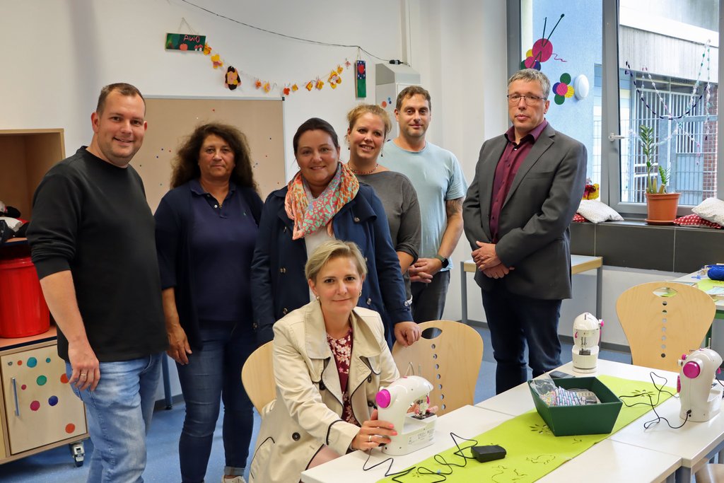 Elternvertreter André Lippitz, Stephanie Lehmann (kommissarische Schulleiterin), Julia Ciesla (AWO, OGS-Koordinatorin für die Standorte in Herten), Christina Graf (OGS-Koordination seitens der Schule), Alberto Andrades (OGS-Teamleiter), Hermann Pieper (Beigeordneter für Bildung und Soziales) und Elternvertreterin Alina Kubacki (sitzend) besichtigten die neu eingerichteten Räume.
