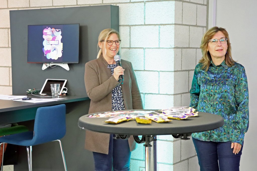 Stefanie Dobberke, Leiterin des Amtes für außerschulische Bildung und Kultur (links), und Elke Hodde-Kalich, Leiterin der Stadtbibliothek (rechts), freuen sich über den offiziellen Start der „Lernbar“.