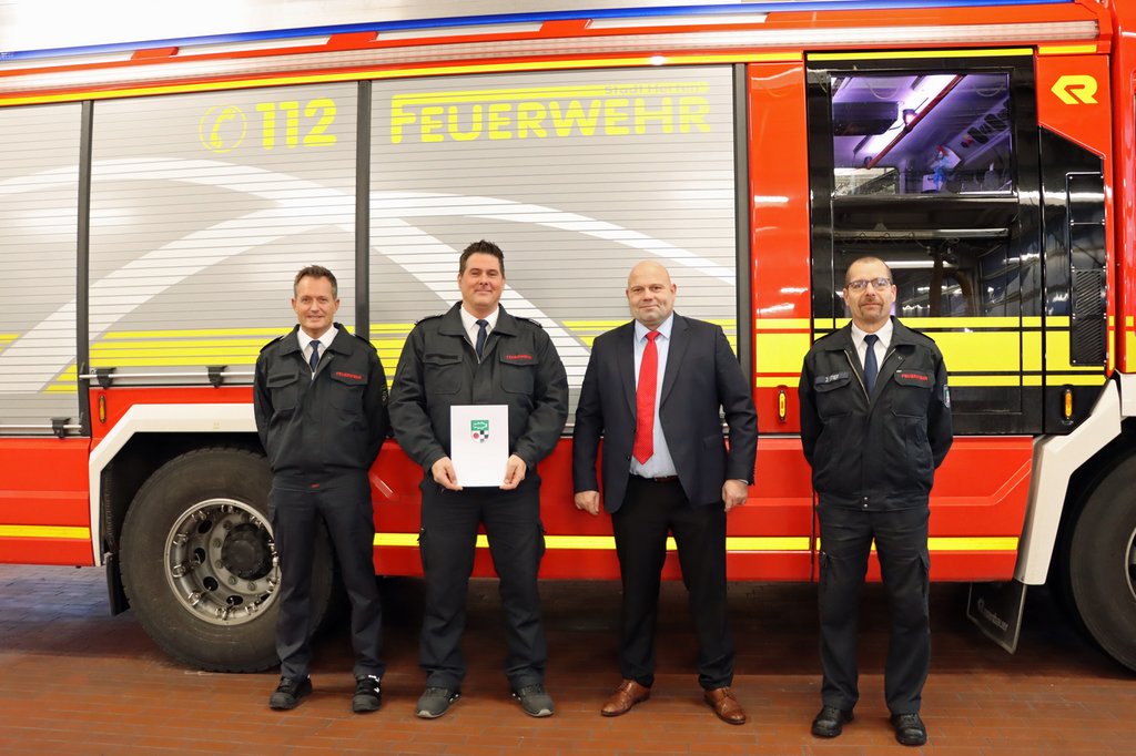 Claas-Tido Hoffmann (2.v.l.) hat zum 1. Januar 2025 die Leitung der Feuerwehr Herten übernommen. Dr. Oliver Lind, Stadtkämmerer und Beigeordneter für Finanzen, Ordnung und Feuerschutz (2.v.r.), nahm ihn gemeinsam mit Jörg Stier (rechts) und Thorsten Geldermann (links) in Empfang (Foto: Corina Plötz-Stadt Herten).