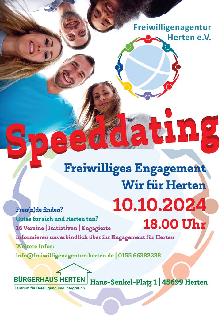 Interessierte können am Donnerstag, 10. Oktober, um 18 Uhr im Bürgerhaus Herten, Hans-Senkel-Platz 1, ohne Voranmeldung am Speeddating teilnehmen. Für Fragen vorab steht die Freiwilligenagentur Herten telefonisch unter 0155 66382238 oder per E-Mail an info@freiwilligenagentur-herten.de zur Verfügung.