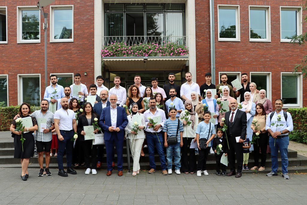 39 Hertener Bürgerinnen und Bürger haben im August 2023 offiziell die deutsche Staatsangehörigkeit erhalten. Im Rahmen einer Einbürgerungsveranstaltung im Rathaus überreichte ihnen Bürgermeister Matthias Müller die Einbürgerungsurkunden. In der feierlichen Zeremonie bekannten sich die Einbürgerungsbewerberinnen und -bewerber aus Syrien, Griechenland, dem Irak, Iran, Aserbaidschan, Thailand, Nepal und Rumänien zur freiheitlich demokratischen Grundordnung. Eine Person war bisher staatenlos.