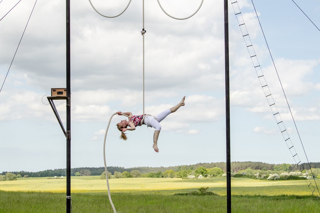 Julia Knaust thematisiert mit beeindruckender Virtuosität am Trapezseil persönliche Ängste, gesellschaftliche Unsicherheiten und die spürbare Veränderung des politischen Klimas. Bevor es für die Artistin hoch hinausgeht, führt ab 17 Uhr ein lebendiger Kleinkunstzirkus spielerisch in den Abend ein.
