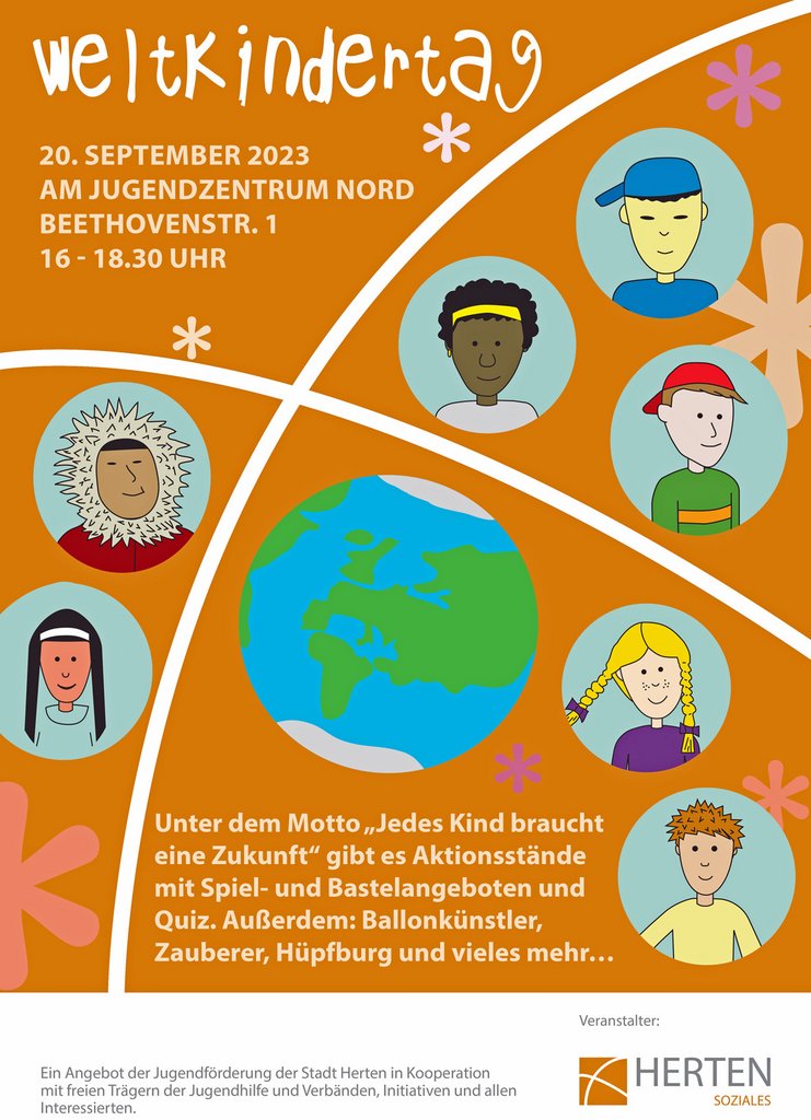 Unter dem Motto „Jedes Kind braucht eine Zukunft“ bietet die Jugendförderung der Stadt Herten zum Weltkindertag am Mittwoch, 20. September 2023, eine Rallye an. Kinder und Jugendliche können zwischen 16 und 18.30 Uhr im Backumer Tal an den Ständen der städtischen Kinder- und Jugendarbeit sowie den Ständen der verschiedenen freien Träger der Kinder- und Jugendarbeit die unterschiedlichsten Aufgaben lösen. |